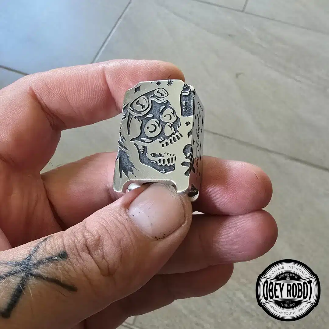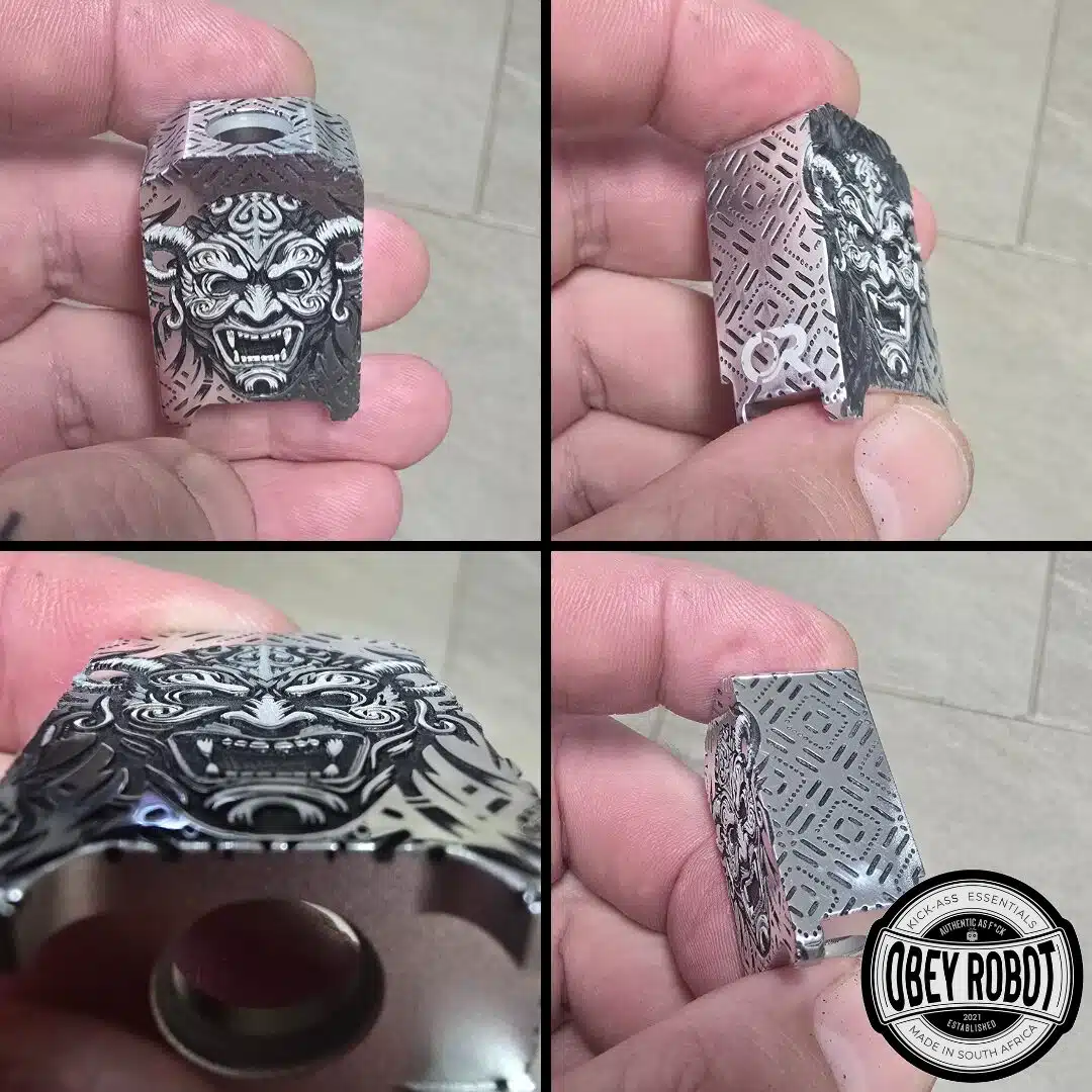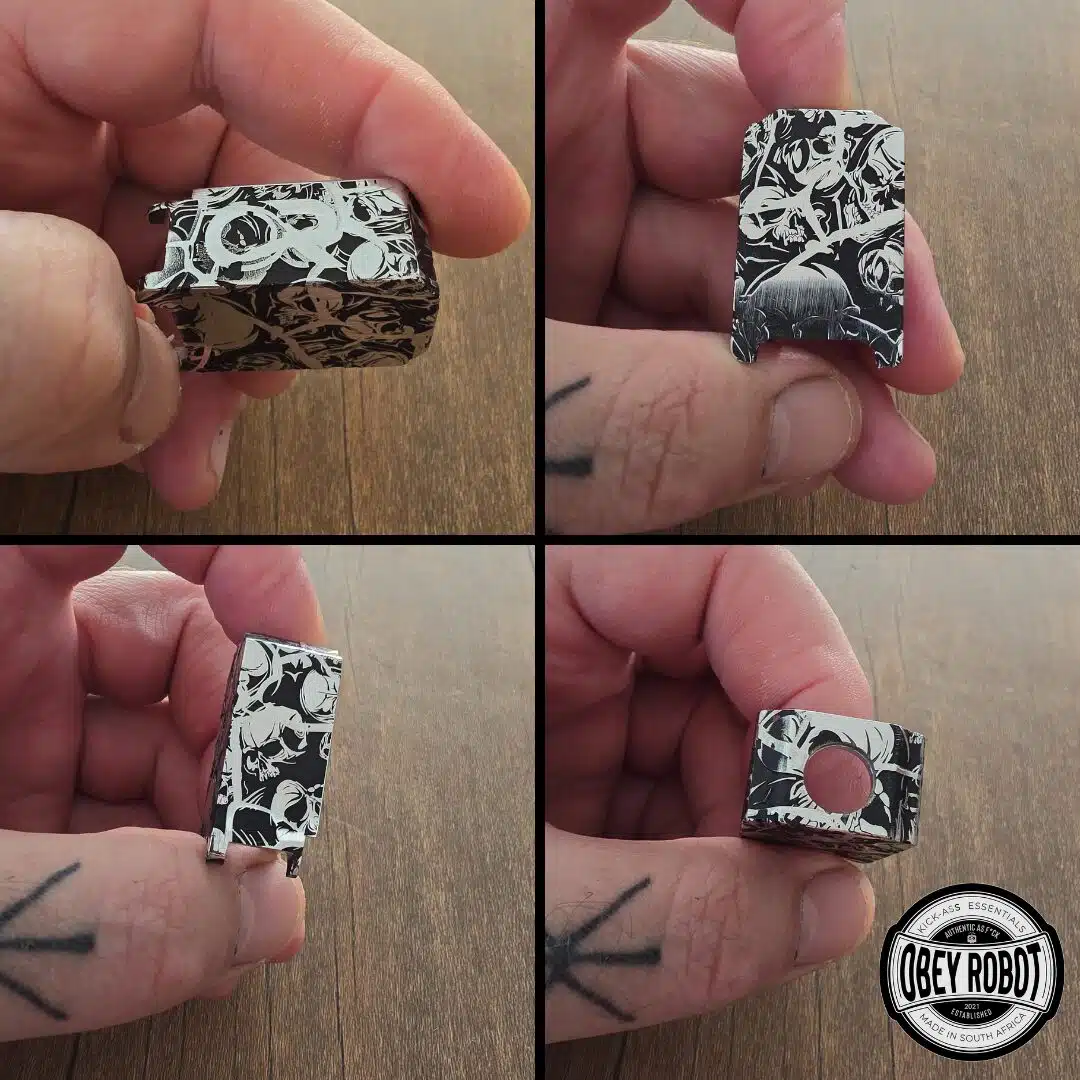 Der Tank zeichnet sich durch eine präzise Lasergravur aus, die oft das Logo von Obey Robot oder andere künstlerische Designs umfasst. Diese Gravur wird mit hoher Genauigkeit durchgeführt und sorgt für ein einzigartiges, ästhetisches Erscheinungsbild.